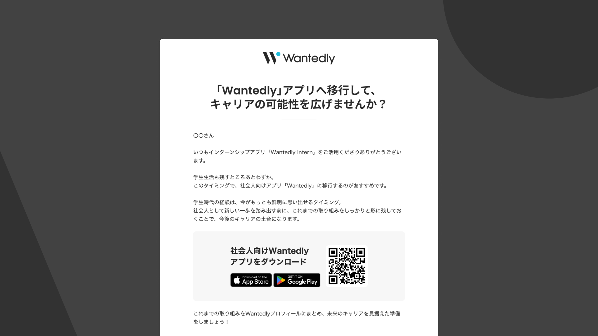 Wantedly Intern Appを利用する卒業予定学生ユーザーへ、Wantedly Appへのスムーズな移行を促すCRM施策を実施。インターン終了後もキャリアに関する最新情報や新しいつながりを継続して得られるよう、最適なタイミングでのメール配信を設計した。