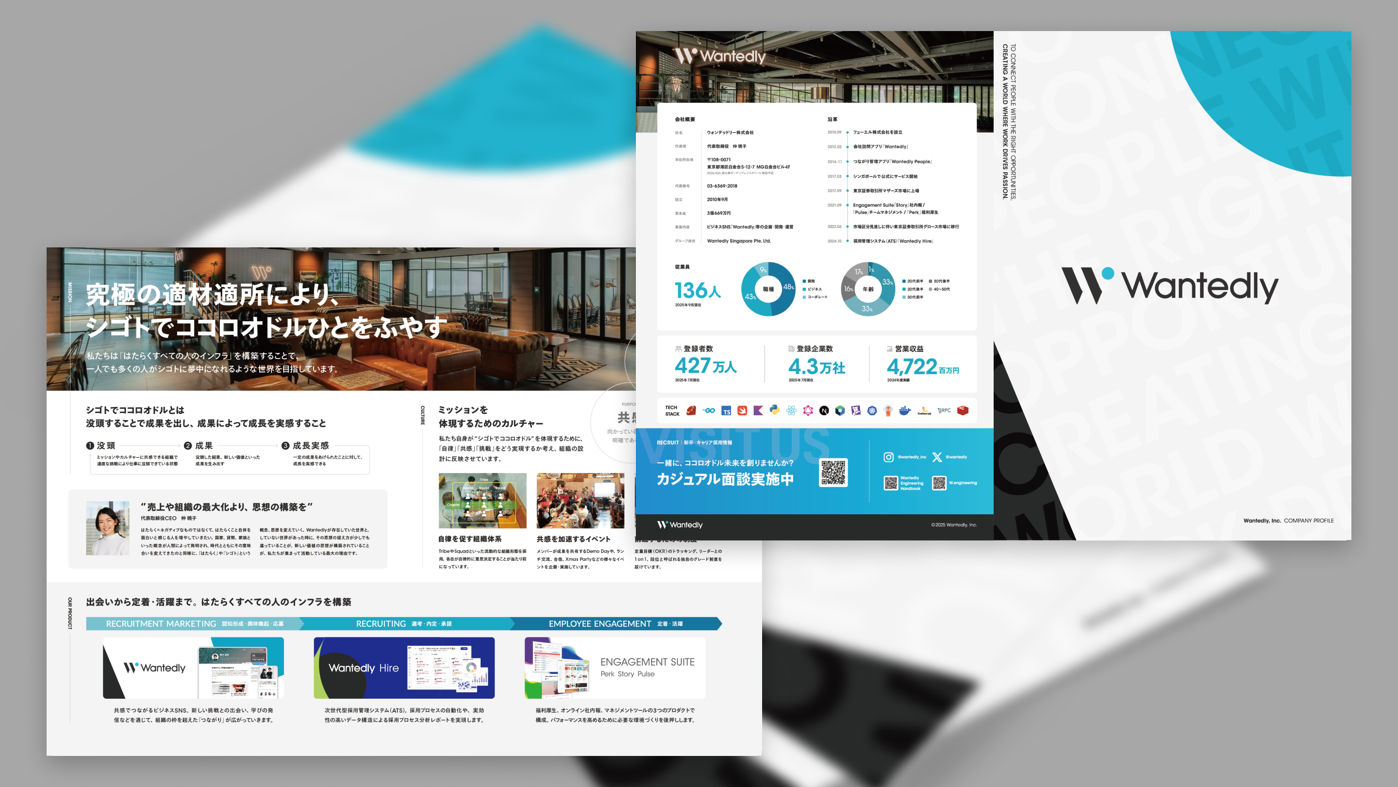 ウォンテッドリーの会社概要をまとめたコーポレートパンフレットを制作。代表メッセージ、事業内容、そして社内のカルチャーを伝えることで、会社理解の促進を図った。