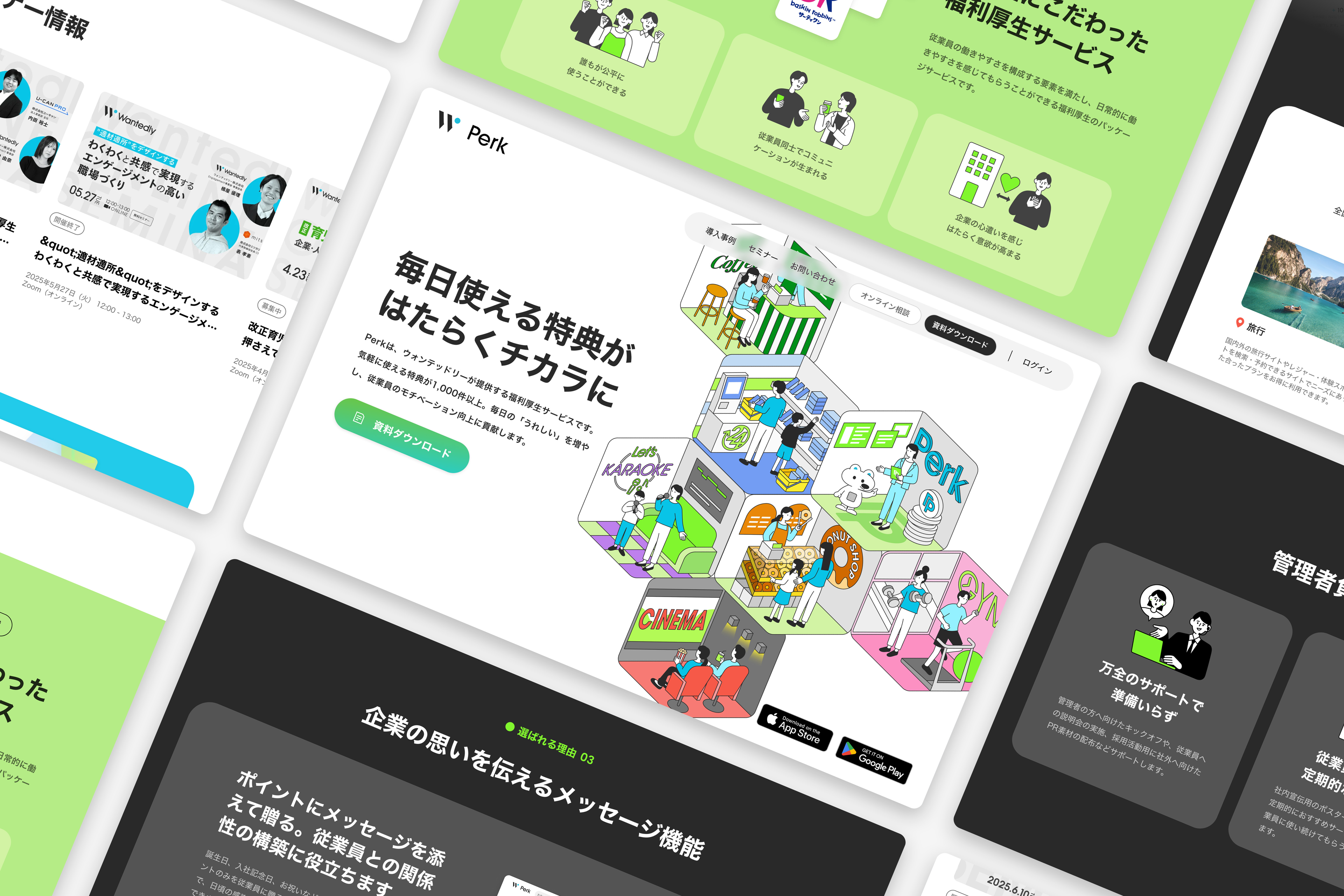ウォンテッドリーが提供する福利厚生サービス「Perk」。サービスの機能や提供範囲が拡大してきたことを背景に、LPデザインのリニューアルを企画・制作した。